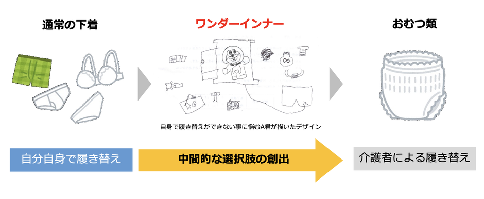 開発者自身も利用者の方から想いを伝えられ、思い悩む日々がありました。そこで、自分自身または一部介助で履き替えが可能となる下着を新たに開発し、これらの課題を少しでも解決したいと考えました。